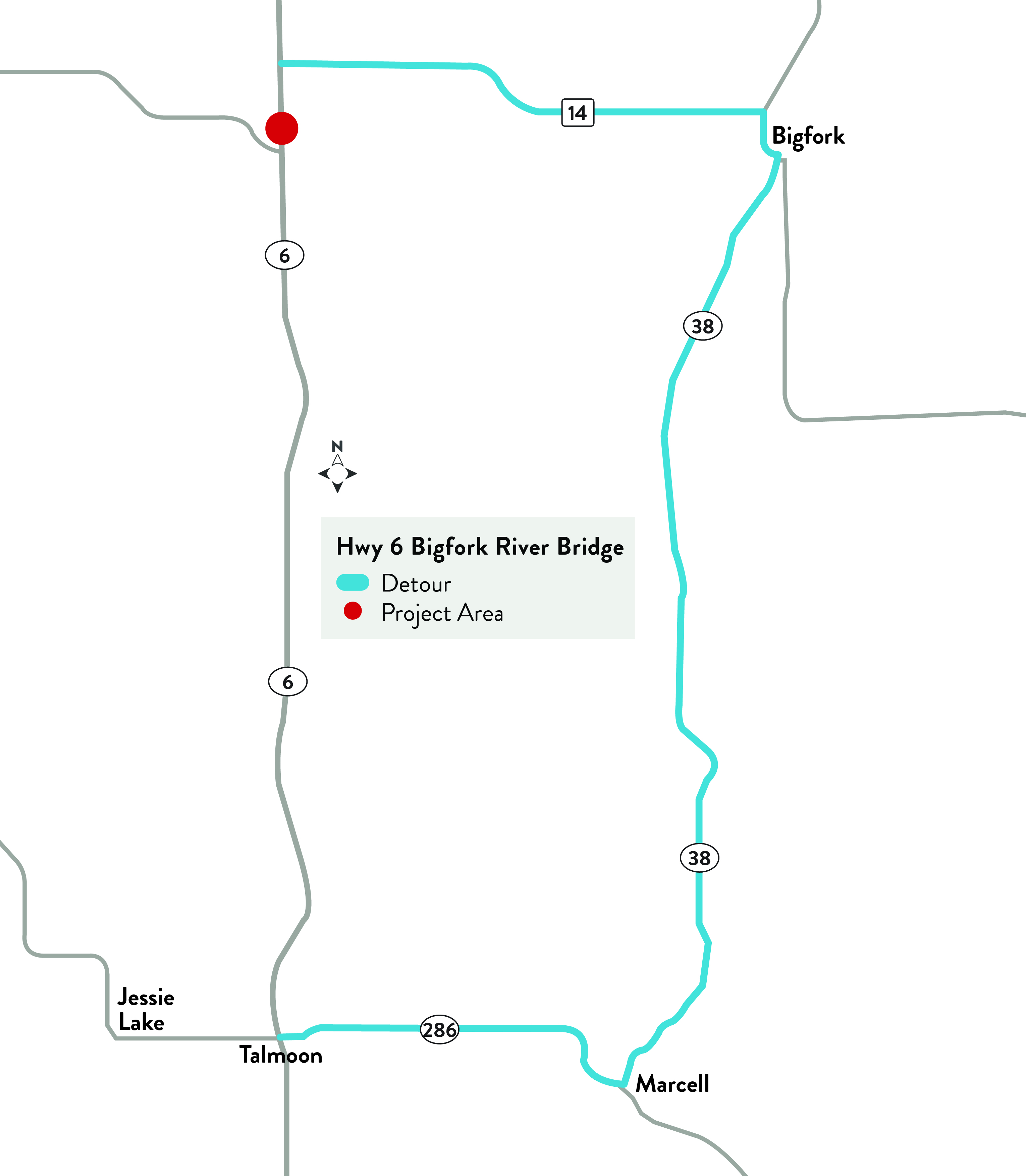 This project will require a full detour of Highway 6 on Itasca County Road 14 to Highway 38 to Itasca County Road 286.