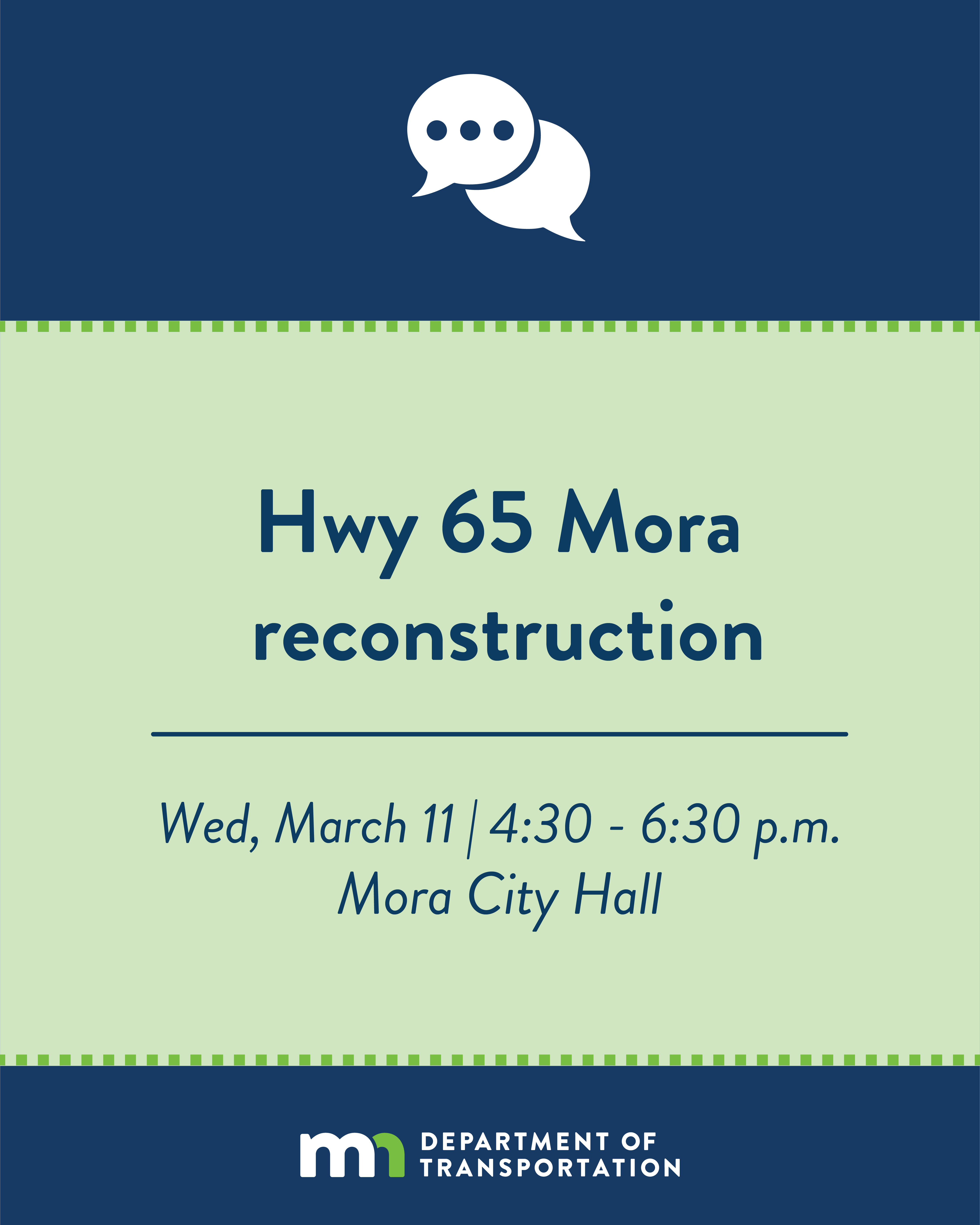 You're invited to visit with us and learn about this future Hwy 65 Mora construction project.