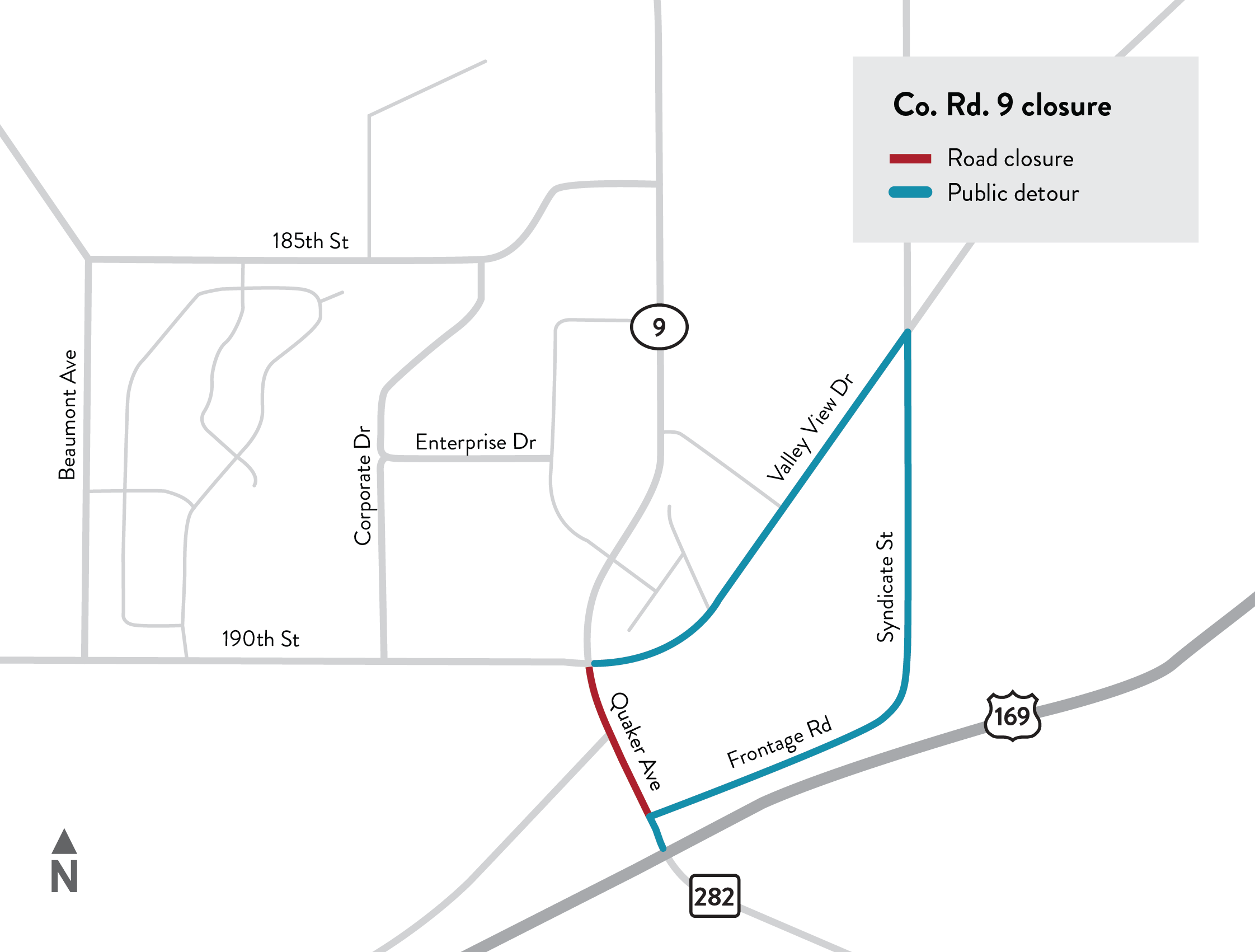 - Co. Rd. 9 is closed between Frontage Rd. and 190th St./Valley View Dr.