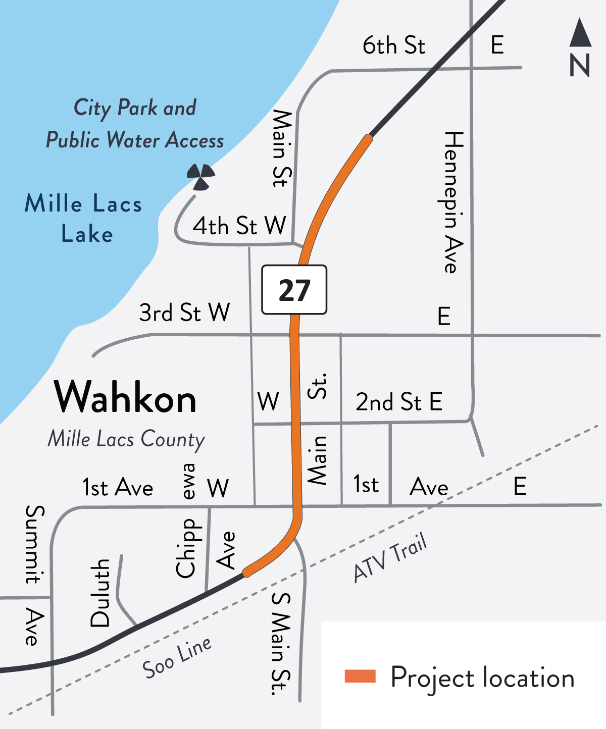 MnDOT will reconstruct and improve Hwy 27 (Main St.) from east of Chippewa Ave. to east of Fourth St. W in Wahkon, Mille Lacs County. Work is scheduled for 2026 and requires a detour.