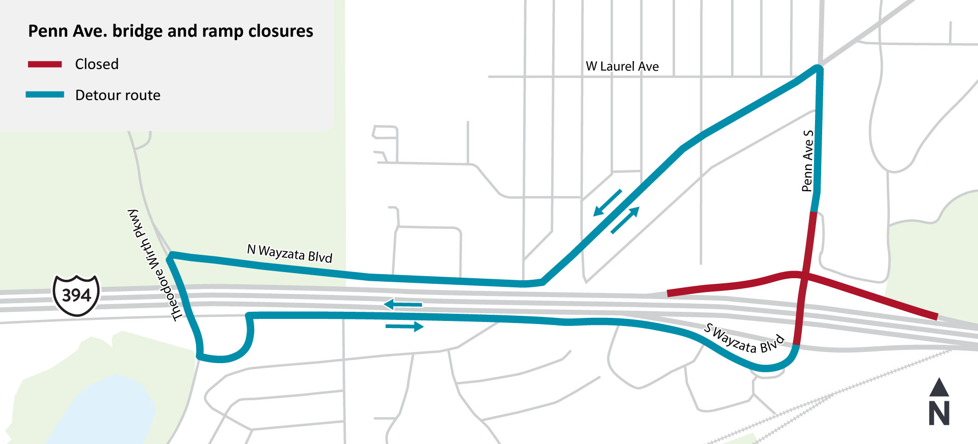 - Detour: Louisiana Ave. to Wayzata Blvd. to Park Place Blvd/Xenia Ave.